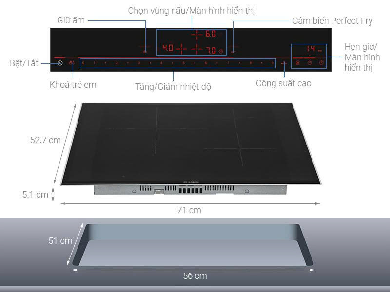 Tiện ích:Nhiều vùng nấu tiện dụngCó hẹn giờCài đặt mức tổng công suất mong muốnChức năng làm nóng nhanhChức năng giữ ấmGhi nhớ cài đặt trước đóCảm biến tự động kiểm soát nhiệt độ dầu ăn17 mức gia nhiệt