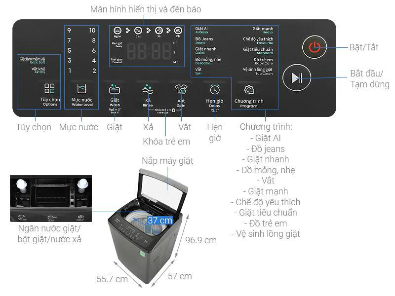 Chương trình:Giặt AIĐồ trẻ emĐồ mỏng nhẹĐồ JeansVệ sinh lồng giặtVắtGiặt tiêu chuẩnGiặt nhanhGiặt mạnhChế độ yêu thích