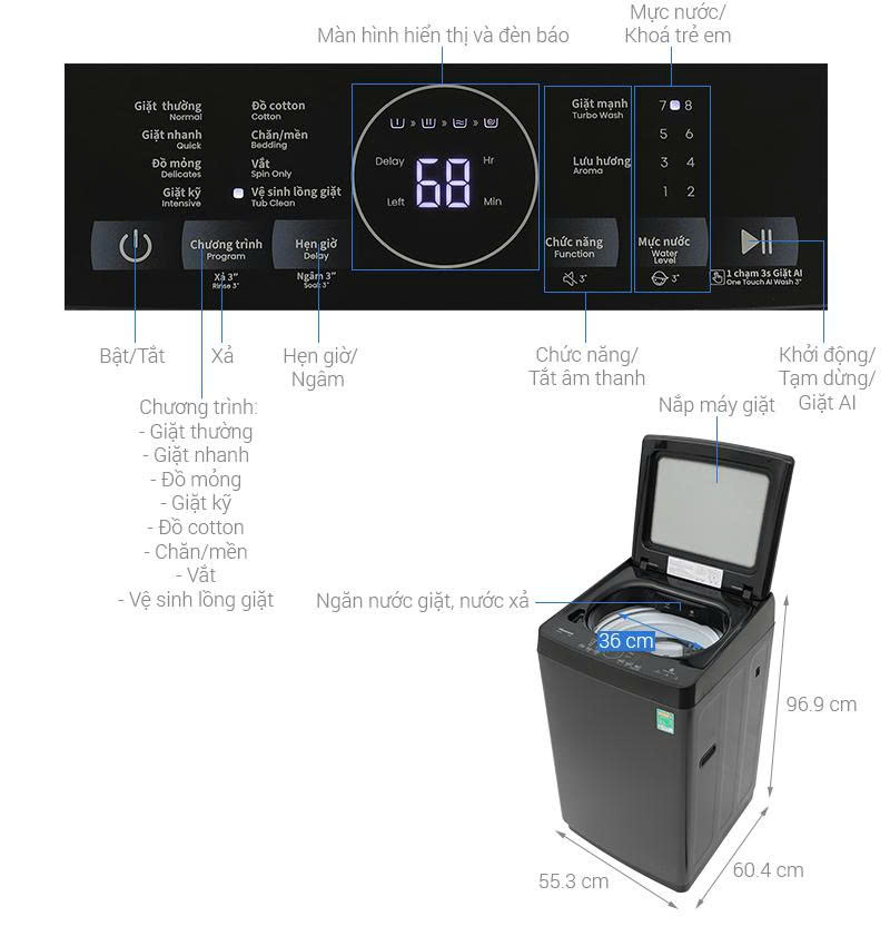 Tiện ích:Xả thêmVệ sinh lồng giặtNắp máy trợ lực chống kẹt tayNgâmMột chạm giặt AIKhóa trẻ emHẹn giờ giặt kết thúcGiặt mạnh Turbo WashCánh quạt Pre-Mix hòa tan bột giặtChỉnh mức độ nước