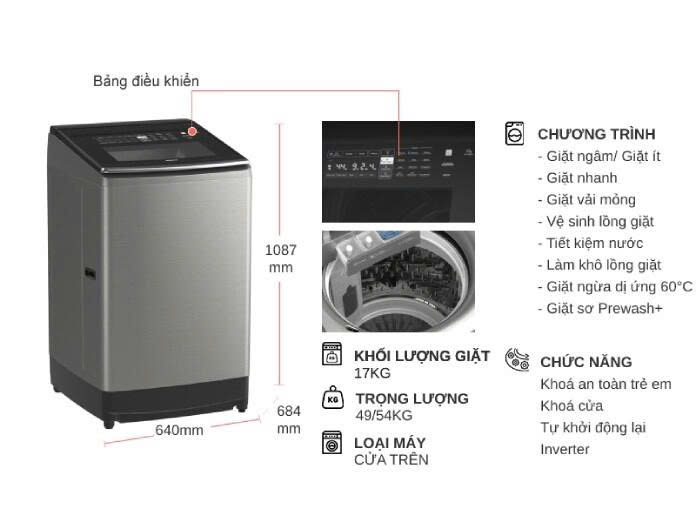 Khối lượng giặt lớn lên đến 17kg, phù hợp với gia đình có đông thành viên