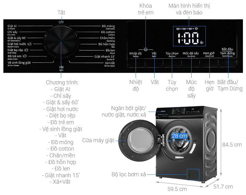 Đa dạng các chương trình: giặt AI, giặt và sấy 60 phút, giặt hơi nước, đồ trẻ em,...