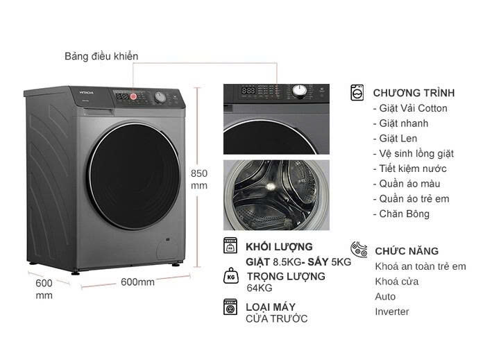 Máy giặt sấy Hitachi khối lượng giặt 8.5Kg, sấy 5kg, phù hợp gia đình đông người